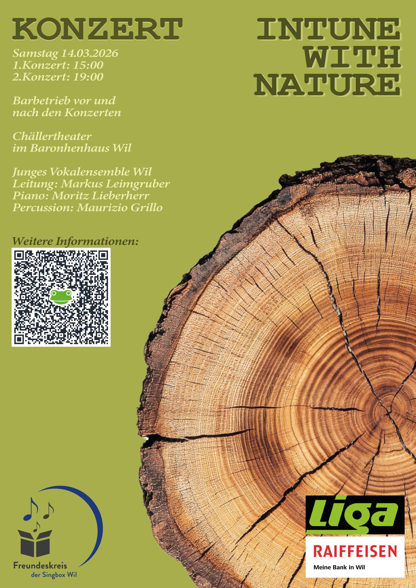 Am Samstag, 14.03.2026, lädt das junge Vokalensemble intune zu einem besonderen musikalischen Anlass mit dem Titel «Intune with Nature» ein. Das Programm der Konzerte widmet sich der Natur mit all ihren Facetten, Stimmungen und Harmonien.