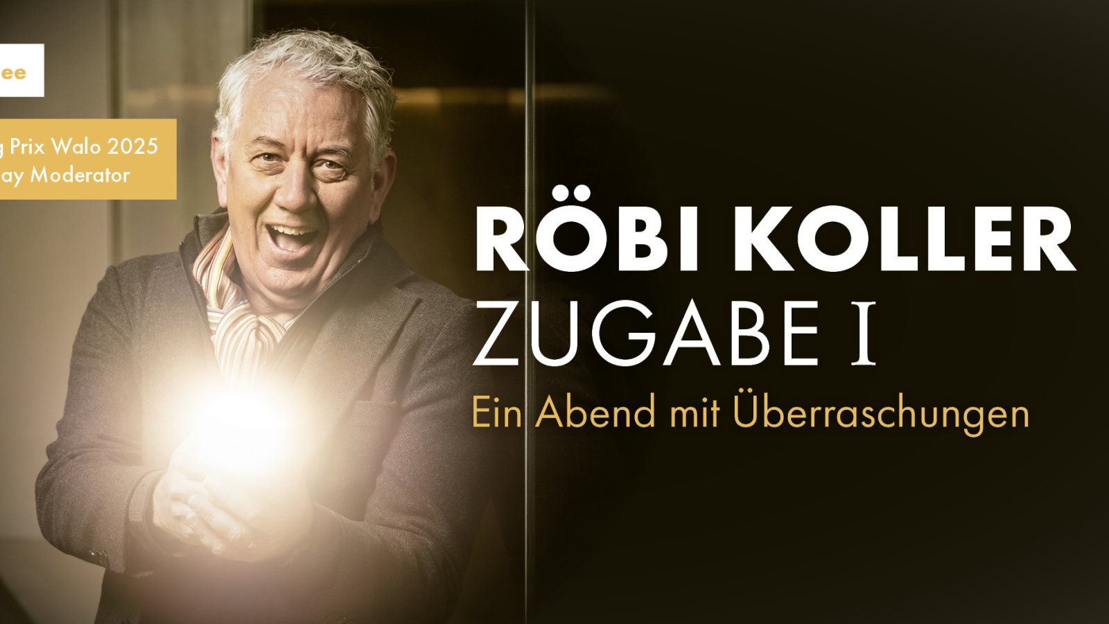 Man kennt ihn aus dem Fernsehen. Man hat mit ihm geweint, gelacht – manchmal sogar beides gleichzeitig. Und jetzt ist er zurück. Röbi Koller betritt erneut die Bühne – diesmal solo. Ohne Studiokameras, aber mit einem Sack voll Geschichten, Sprachwitz und vielen Überraschungen. Röbi Koller, die Happy-Day-Ikone und diesjähriger Prix-Walo-Publikumsliebling, präsentiert sein erstes Bühnenprogramm: «Zugabe – Ein Abend mit Überraschungen.»