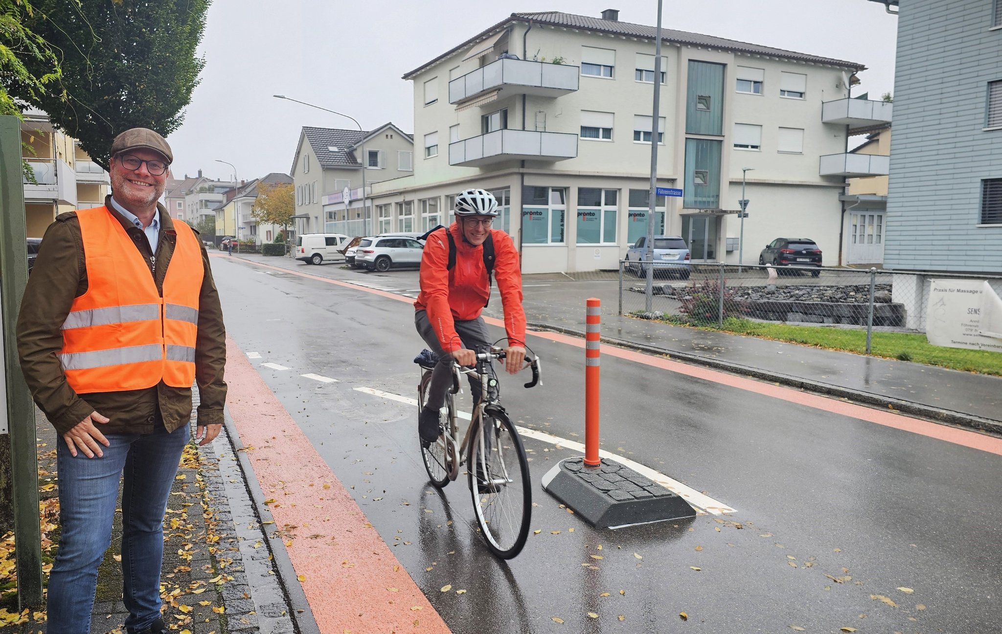 In den nächsten Tagen werden die bisherigen orangefarbenen Leitpfosten deshalb durch neue, dickere Leitpfosten mit verbesserten gelben Reflektoren ersetzt, um die Sichtbarkeit und damit die Verkehrssicherheit weiter zu erhöhen. Der Freiraum am rechten Fahrbahnrand ist vollständig für den Veloverkehr vorgesehen. Das Farbband entlang der Velostrasse dient als optische Markierung für die gesamte Velostrasse.