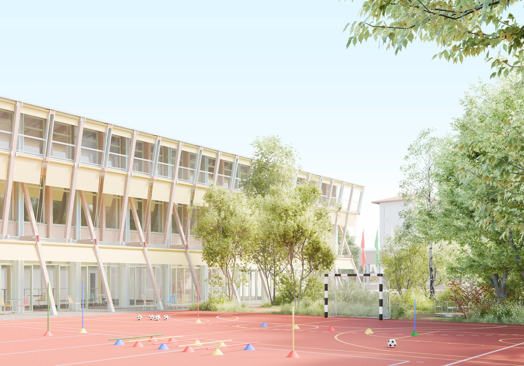 Das Projekt «Webstuhl» zeichnet sich durch eine klare, funktionale Struktur aus. Im Zentrum steht ein grosszügiges Foyer, das Aula, Turnhalle und Tagesstruktur verbindet. Die Architektur ermöglicht kurze Wege, eine gute Übersicht und klare Trennungen zwischen den verschiedenen Nutzungsbereichen.