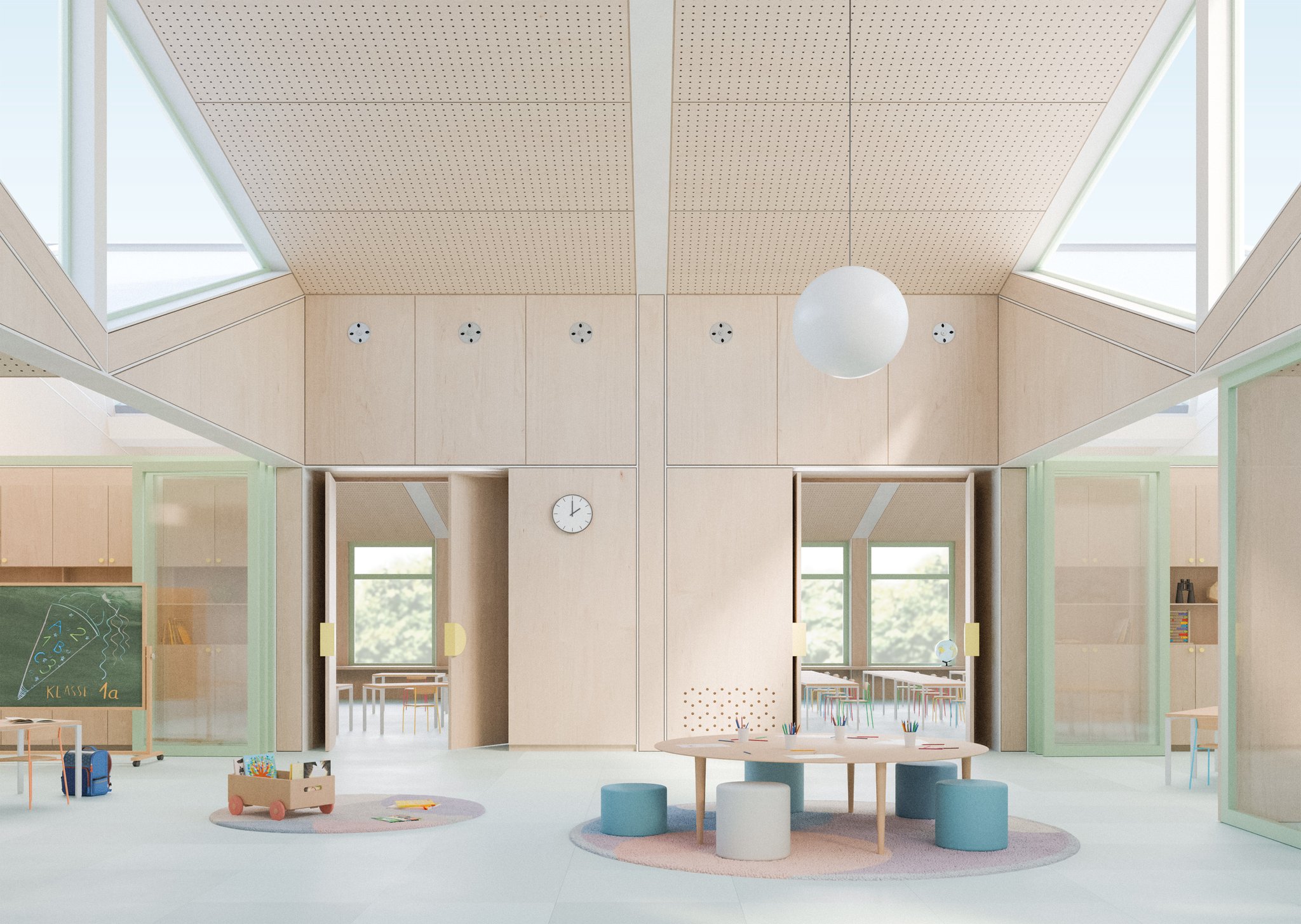 Die Klassenräume sind nach dem Cluster-Prinzip organisiert. Kleine, überschaubare Einheiten bieten Raum für unterschiedliche Unterrichtsformen, fördern Begegnung und unterstützen individuelle Lernwege. Eine raumhohe Glasfront gewährt Einblicke in die Doppelturnhalle, während die Aula als eigenständiger kultureller Raum gestaltet ist.
