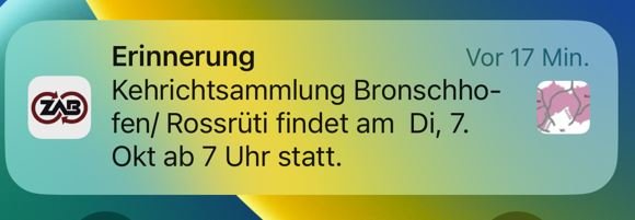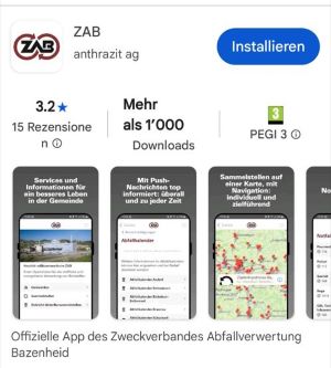 Der Zweckverband Abfallverwertung Bazenheid (ZAB) stellt eine App zur Verfügung. Über diese App können Sie Push-Nachrichten aktivieren, die sie über die Abfalltouren in Ihrem Quartier auf dem Laufenden halten. Die App ist über den App Store oder Google Play verfügbar.