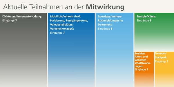 Ihre Rückmeldungen haben uns ein breites Spektrum an Anliegen aufgezeigt, die von Dichte und Innenentwicklungsstrategien über die Bedeutung von Freiräumen für unsere Lebensqualität, CO<sub>2-</sub>Reduktion, Energie bis hin zu Fragen des sozialen und altersgerechten Wohnens reichen. Besonders hervorzuheben ist dabei das Thema Verkehr, das in den bisher eingegangenen Beiträgen eine zentrale Rolle spielt. Wir verstehen, dass der Verkehr äusserst wichtig ist, und leiten deshalb alles, was dieses Thema betrifft, an die Kollegen der Verkehrsplanung weiter. Sie stellen derzeit das Gesamtverkehrskonzept und die Erschliessungskonzepte fertig und führen Verkehrsmessungen durch, um den Richtplan Verkehr genauer zu detaillieren.