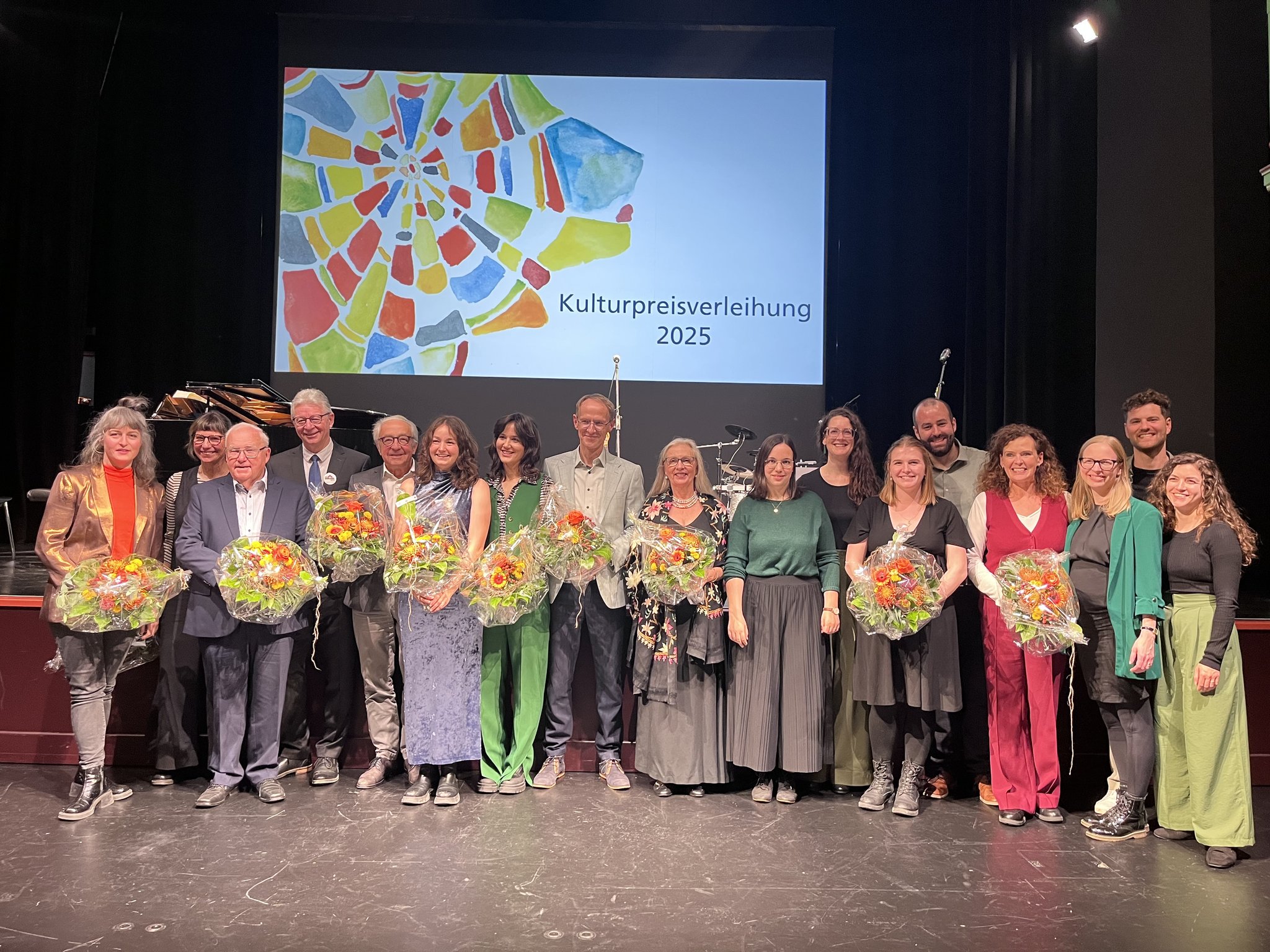 Die Preisträgerinnen und Preisträger 2025 inkl. Laudatorinnen und Laudatoren v.l.n.r.: Myriam Gämperli, Patricia Steinmann, Rolf Benz, Hans Mäder, Bruno Gähwiler, Olivia Vera Elger, Marina Niedermann, Hans Adolfsen, Lina Maria Åkerlund, Lukas Pelzmann und Vorstand Verein Vorderste Reihe, Florence Leonetti