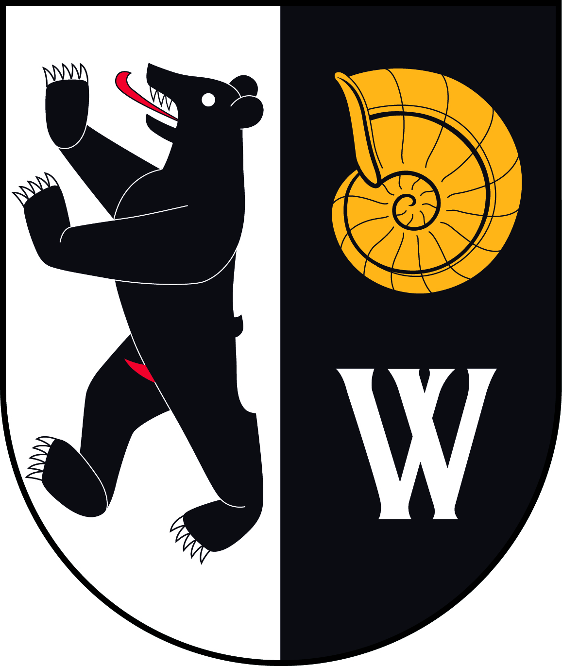 - Blasonierung / heraldische Beschreibung: Gespalten von Weiss mit aufrechtem schwarzem Bär mit roter Zunge und Geschlecht, und von Schwarz mit gelbem Schneckenhaus über lateinischem weissem V-doppio.